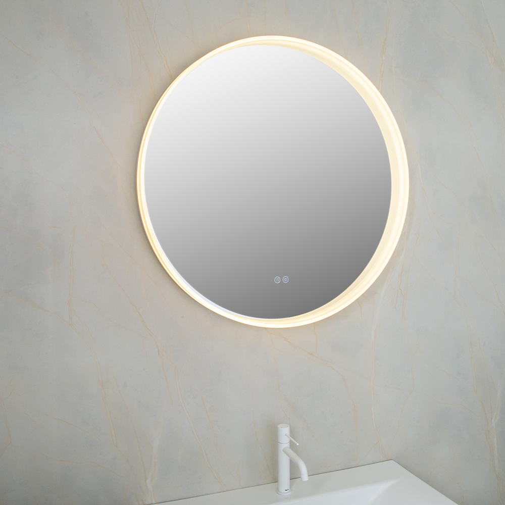 Зеркало из серебра без меди толщиной 5 мм с защитной пленкой сзади. Три цветовые температуры. Водонепроницаемость IP44. Мощность нагрева: 28 Вт. Мощность подсветки: 24 Вт.