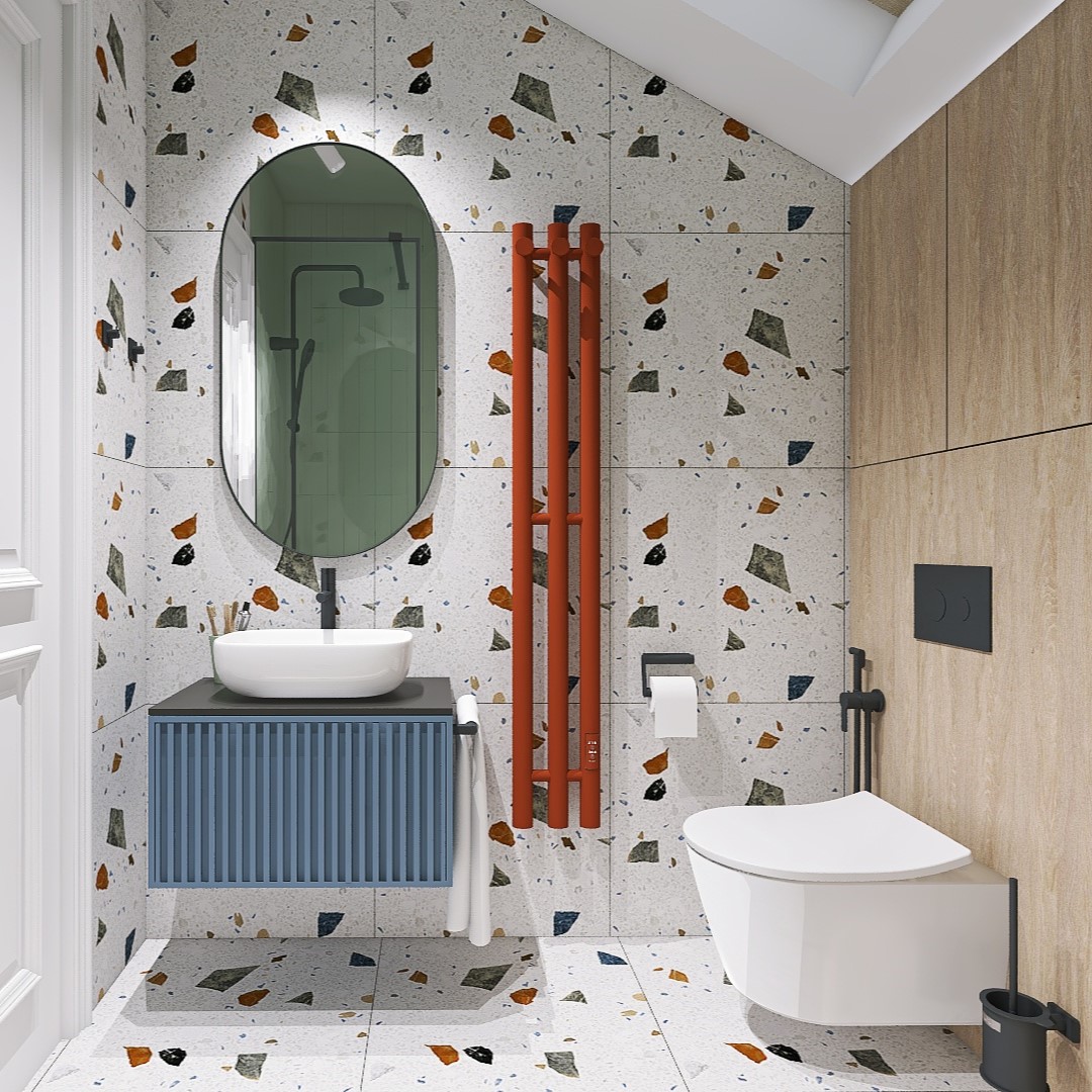 Яркие пятна на плитке тераццо и мятный акцент, создающие ощущение игривости и свежести.